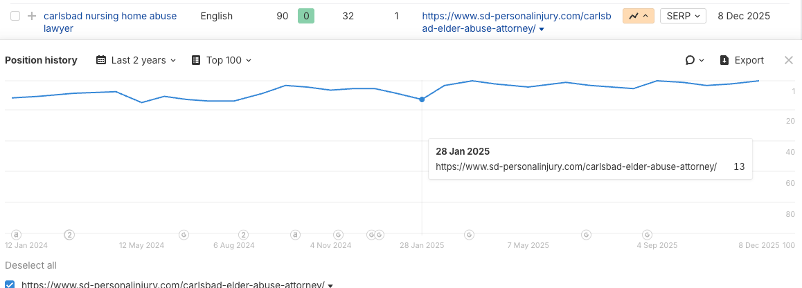 Adding more proof, trust signals such as testimonials and adding localized content targeting users instead of traditional SEO methods allowed Stipp Law to increase in overall rankings and land in the 1st page in Google Search for both Carlsbad Nursing Home Abuse Attorney, and the 1st Position for Carlsbad Elder Abuse Attorney